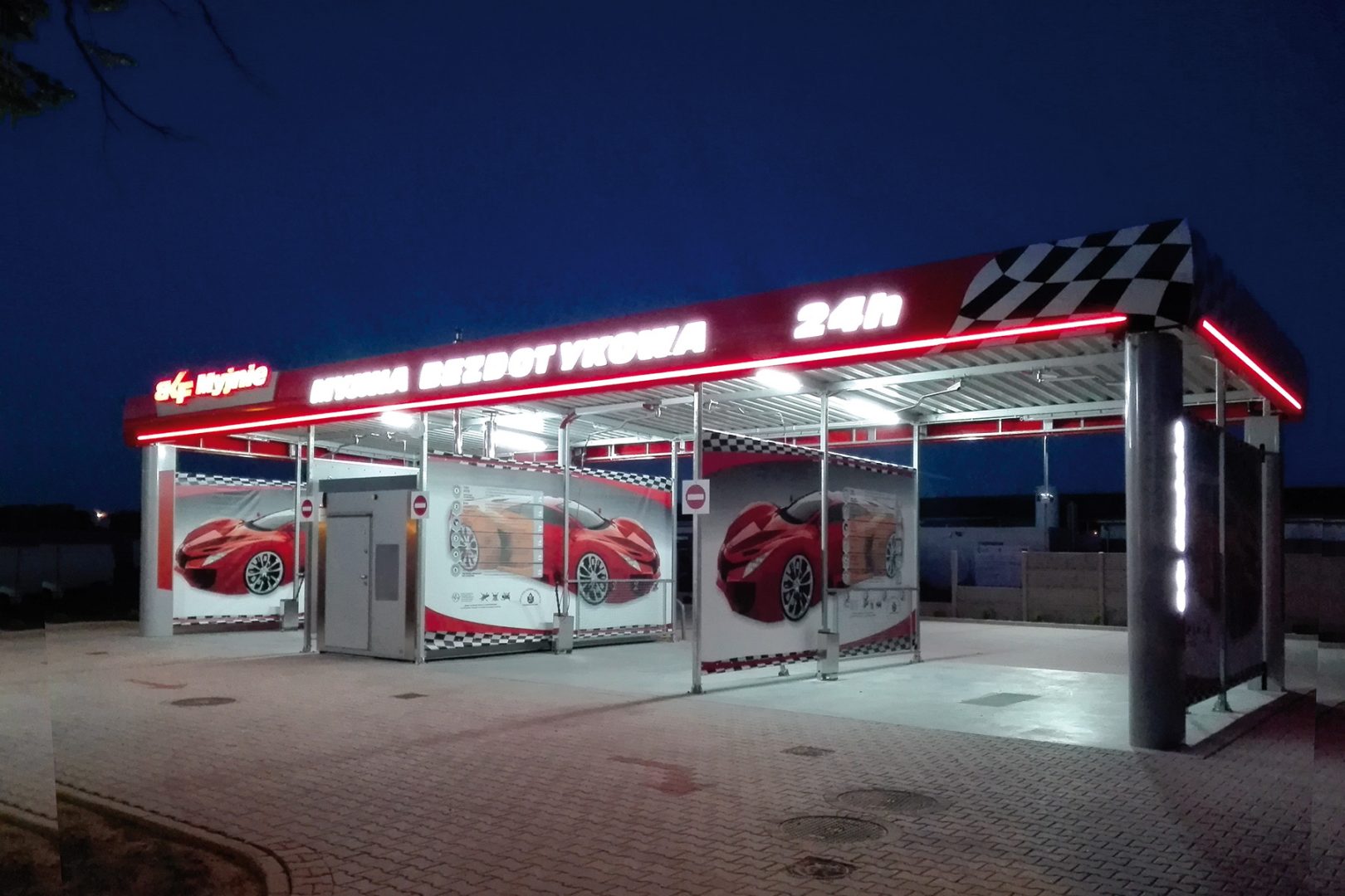 Attic 90 cm height, powder painted with the selected RAL color, 3D logotype, extruded letters, enlighted. LED lighting bar along the attic.